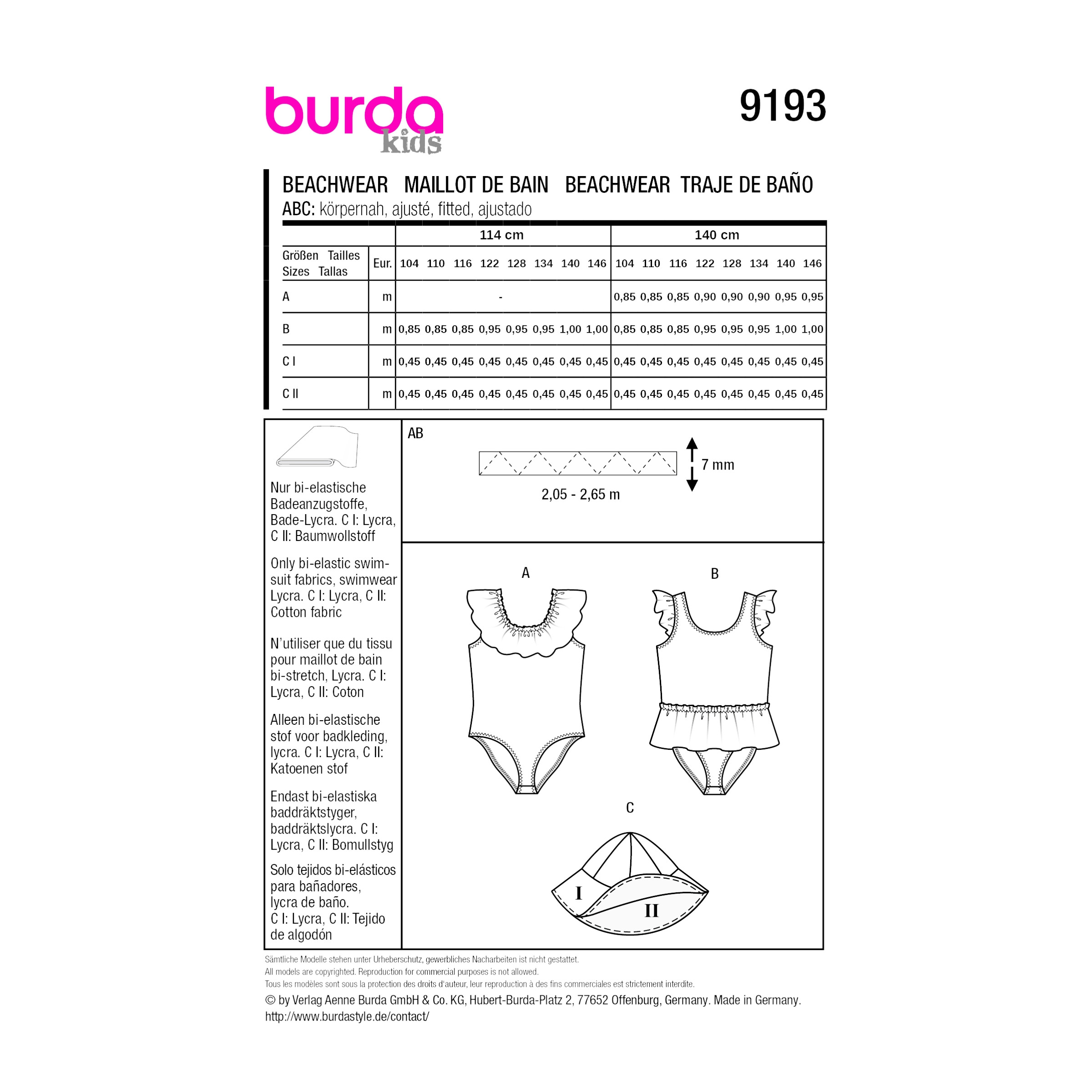 Mit dem Burda Kids Schnittmuster 9193 – Strandmode und Badeanzug für Mädchen nähst Du fröhliche Sommermode für sonnige Tage am Wasser. Der bequeme Badeanzug ist ideal für Strand, Schwimmbad oder Urlaub und bietet viel Bewegungsfreiheit beim Spielen, Schwimmen und Toben.