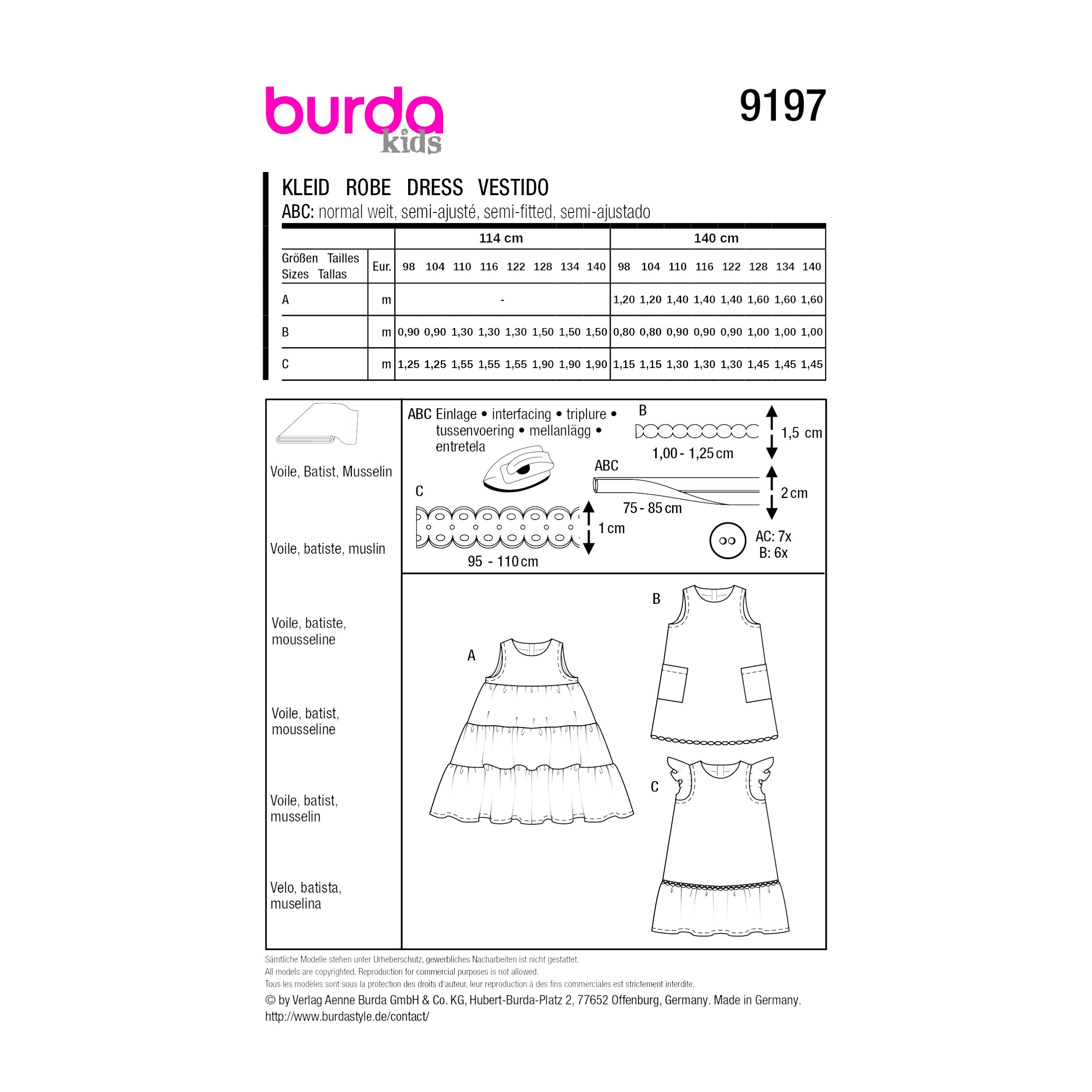 Mit dem Burda Kids Schnittmuster 9197 – Sommerkleid für Mädchen nähst Du ein leichtes und fröhliches Kleid für warme Tage. Der luftige Schnitt sorgt für eine bequeme Passform und viel Bewegungsfreiheit – perfekt zum Spielen, Toben und für sommerliche Ausflüge.