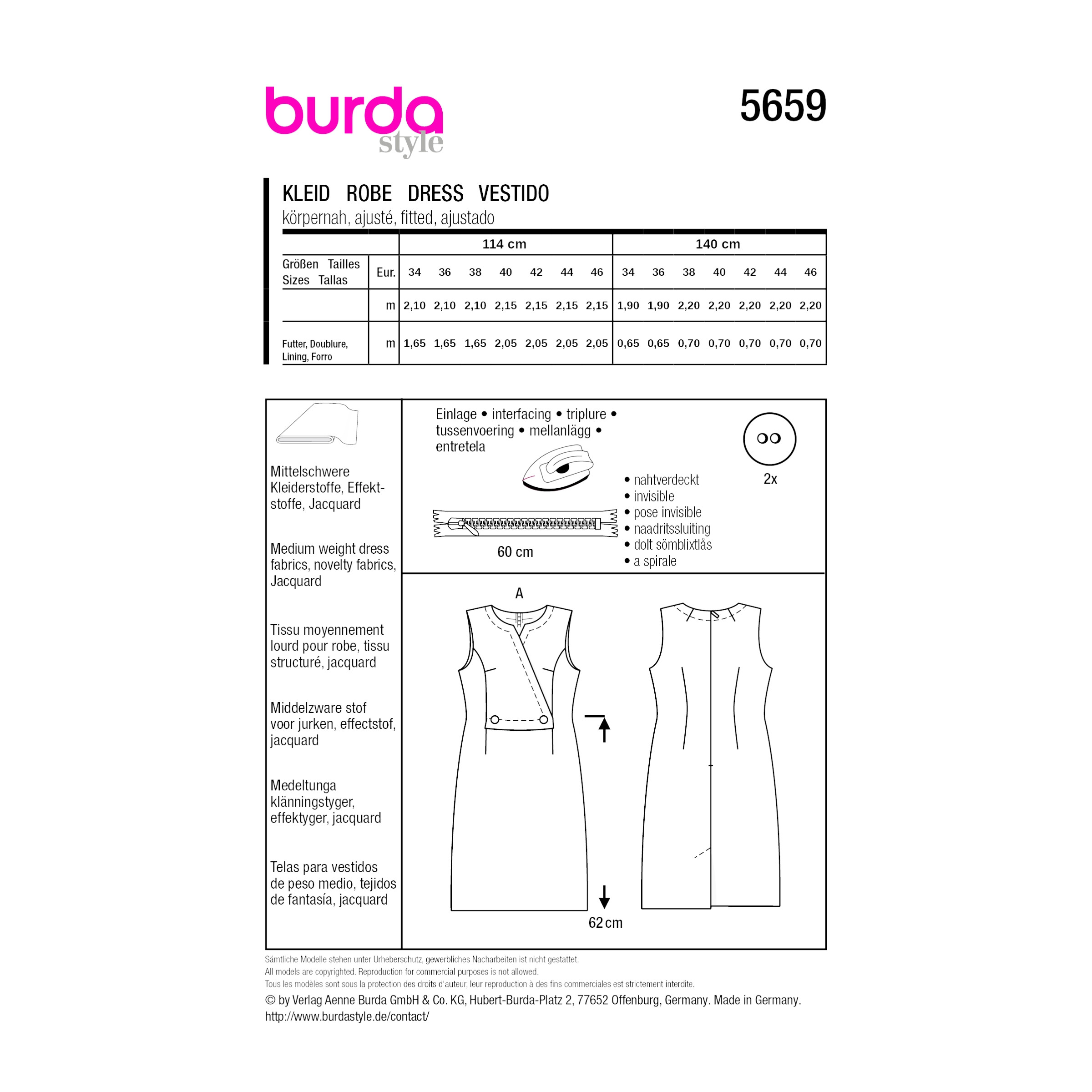 Mit dem Burda Style Schnittmuster 5659 – elegantes ärmelloses Etuikleid nähst Du Dir einen zeitlosen Klassiker für Deinen Kleiderschrank. Der figurbetonte Schnitt betont Deine Silhouette und sorgt für eine stilvolle, feminine Ausstrahlung – perfekt für Business, festliche Anlässe oder elegante Alltagslooks.