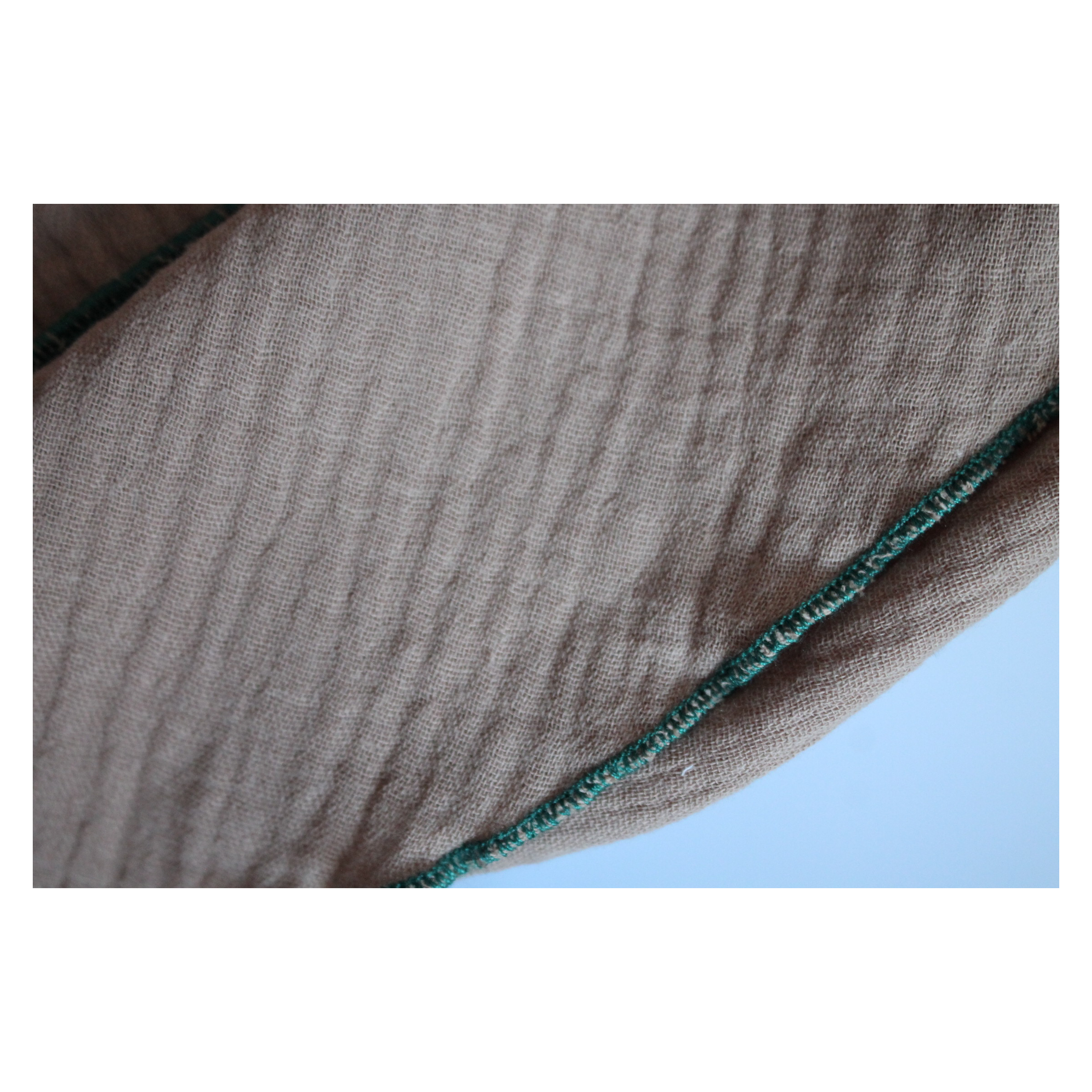 Das große Tuch ist einlagig in einem Uni Musselin der Farbe Beige gearbeitet, Auf Grund seiner Größe gibt es genügend Spielraum zum Binden und Umlegen. Der Rand wurde mit einem Rollsaum in Grün verarbeitet.