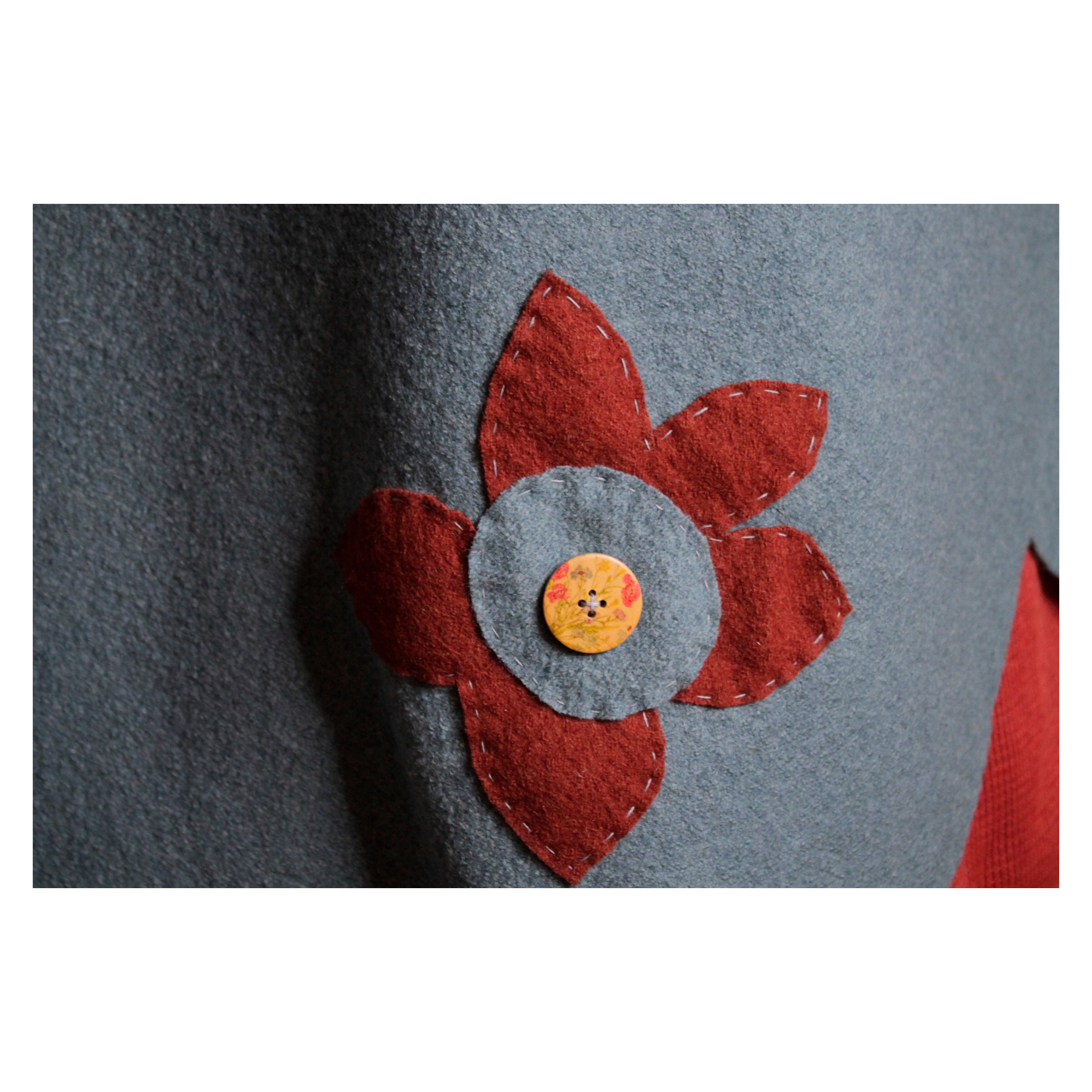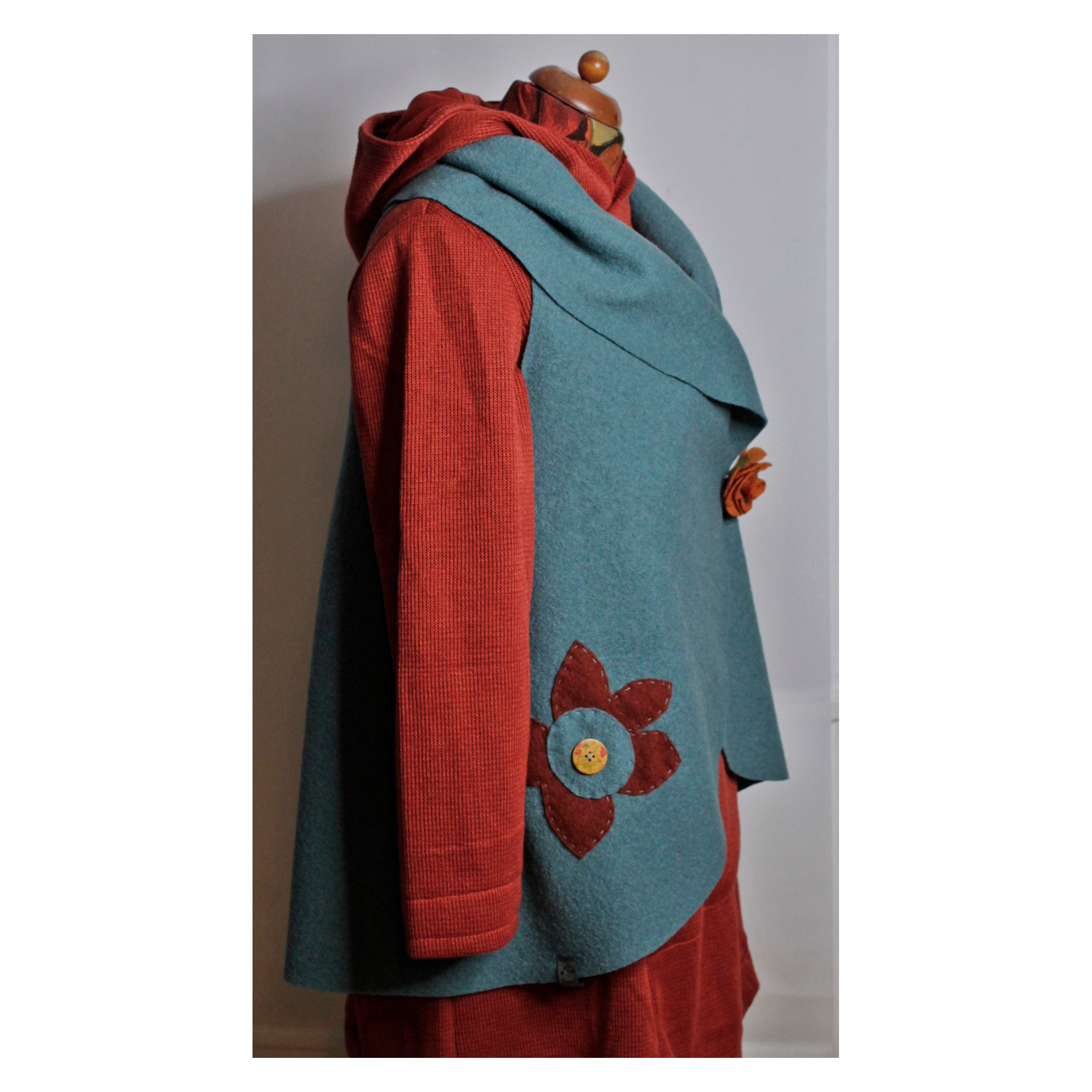 Hier handelt es sich um eine Weste aus Walkloden (gewalkter Wolle) in der Farbe helles Petrol. Sie ist Kreis ähnlich im Schnitt und hat auf einer Seite vorn eine applizierte Blüte mit Holzknopf. Sie eignet sich super als Outdoor Weste über dicke Pullover oder Jacken. Aber auch in einem kühleren Raum ist sie durchaus angenehm zu tragen.