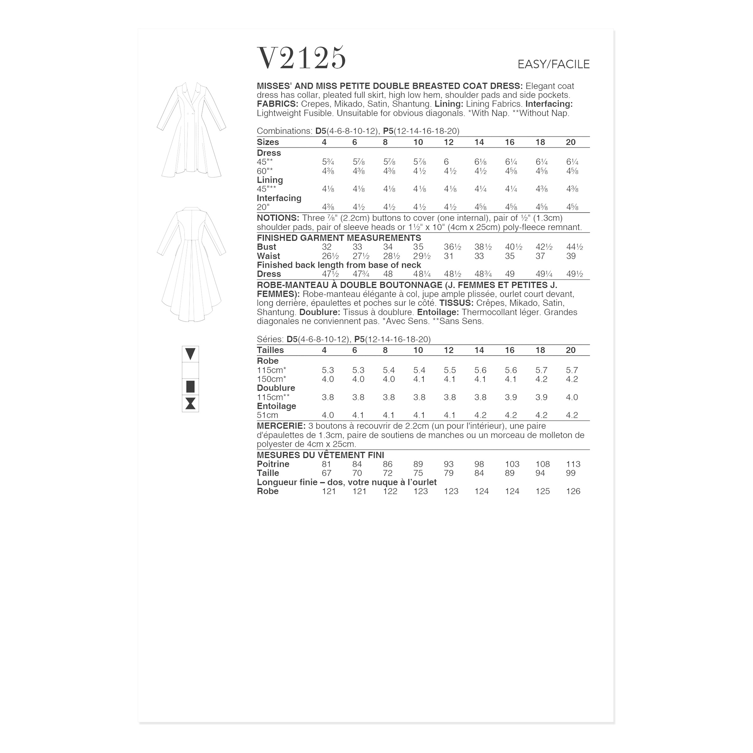 Vogue Schnittmuster – V2125 – ausgefallenes Mantelkleid, doppelreihig